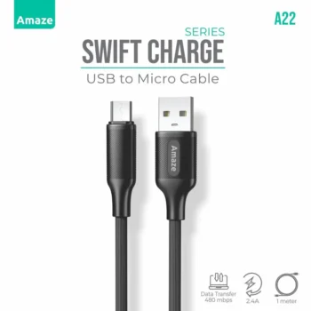 ₨ 531Original price was: ₨ 531.₨ 450Current price is: ₨ 450.Experience fast, reliable, and durable charging with the Amaze SWIFT CHARGE Micro USB Cable A22. Designed for devices with Micro USB ports, it delivers 2.4A high-speed charging and smooth data transfer up to 480 Mbps, making it perfect for smartphones, tablets, headphones, speakers, and other electronics.